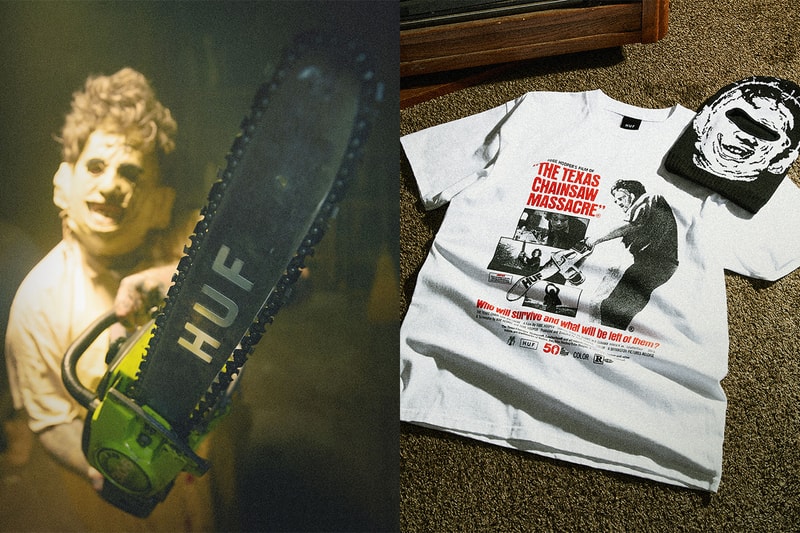 〈HUF〉と『悪魔のいけにえ』のコラボレーションアイテムでは、スケートの美学と映画の陰惨なビジュアル、そしてアイコニックなレザーフェイスを被ったキャラクターが融合されています。映画のオリジナルポスターからインスピレーションを得たタイポグラフィやデザインが取り入れられており、映画のスチール、イラスト、再構成されたグラフィックを組み合わせ、コレクション全体でチェーンソーのモチーフが表現されています。