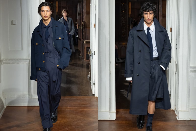 具体的には、ヴェルヴェット調のショールカラーのセットアップ、ルック全てをネイビーで統一したコーディネート、ロングコートにショーツを合わせた気鋭スタイル、モヘアのカーディガンにダボっとしたフランネルパンツなど当時のエスプリを感じさせるアイテムが多数登場。
