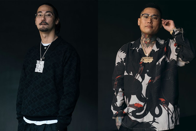 今回のコレクションでは、GAKKINが描き下ろしたアートワークを使用したアイテムが登場しています。ハワイアンシャツ(38,500円)、ジャカードニットポロ(30,800円)、ベロアセットアップ(トップス:22,000円、イージーパンツ:24,200円)などがラインナップされています。それぞれには、花罰家紋や松煙墨、赤目鶴など、ユニークなアートワークが施されています。写真家 水谷太郎が撮影したルックには、舐達麻のメンバーに加えて、ラッパーのJin DoggやTAKABOも参加しています。