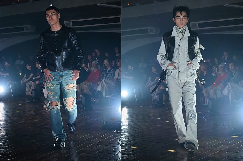 定番のデニムは、ダメージ加工がされたものから左右で表情が異なるディテールが施されたものなど、多岐にわたりました。他にも、全体に無数のホールを穿ったトレンチコート、編み上げディテールを配したチェックシャツ、そしてソリッドな存在感を放つハーネスなど、ブランドのアーカイブを再解釈したアイテムが随所に散りばめられていました。