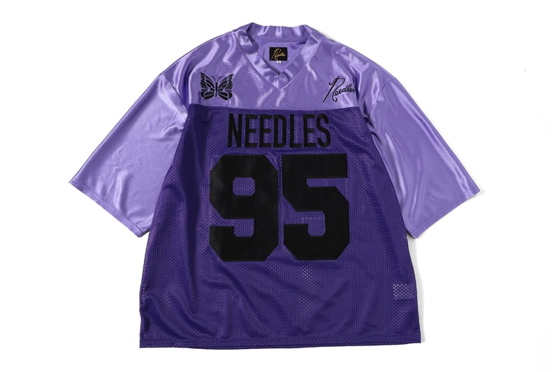 今回のカプセルコレクションでは、ブラックとパープルの2色展開のメッシュジャージ2型と、ブラック/インディゴのデニムショーツ2型が登場。メッシュジャージは、胸元に“NEEDLES”の文字を大胆に配し、右サイドには象徴的なパピヨンバタフライ、左サイドにはシグネチャーロゴが刺繍されるなど、細部にまでブランドのDNAが息づく。パープルバージョンは、肩と袖にパステルカラーのナイロンシルクを切り替え、濃いパープルのメッシュボディとのコントラストが際立つツートーン仕様に。一方のブラックバージョンは、刺繍の代わりにクリーンなホワイトのステッチが効いた、オールブラックの洗練されたルックスに仕上げられている。
