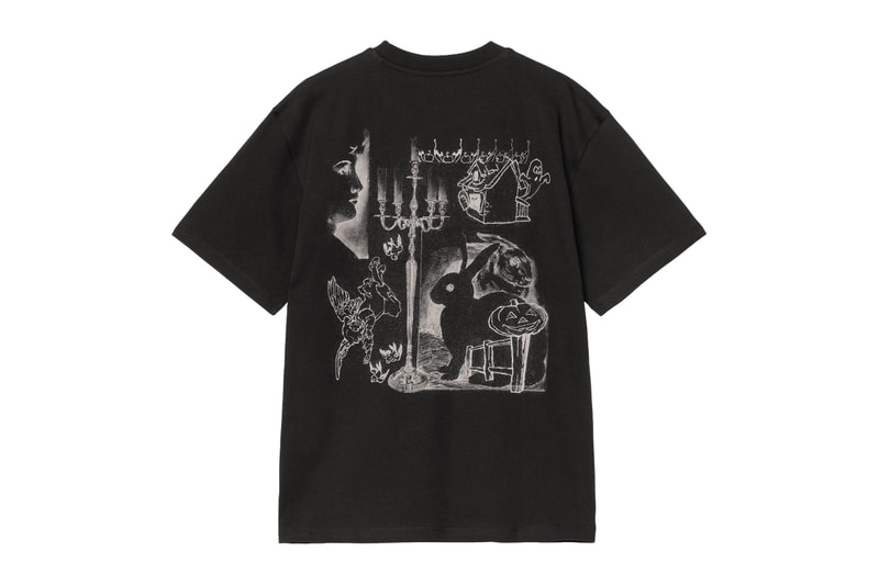 今回のコレクションでは、メンズとウィメンズで3種のデザインを展開しています。そのうち2つはモノクロ仕様で、フロント胸元には〈Carhartt WIP〉ロゴを配置し、プリントプレス風のレタリングを採用し、フルスペルでブランド名が刻まれています。背面には、okniceokらしい緻密な鉛筆画コラージュが大胆にプリントされており、各デザインが異なる物語を描いています。レディースTシャツでは、秋の空気を感じさせるムードを演出するモザイク調のグラフィックが特徴です。