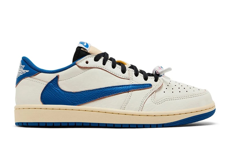 トラヴィス・スコット(Travis Scott)と藤原ヒロシ主宰の〈fragment design(フラグメント デザイン)〉、〈Jordan Brand(ジョーダン ブランド)〉によるトリプルコラボ Air Jordan 1 Low OGの新色 “Sail/Military Blue”のアイテム画像がスニーカーコレクター御用達のマーケットプレイス『GOAT』に登場した。