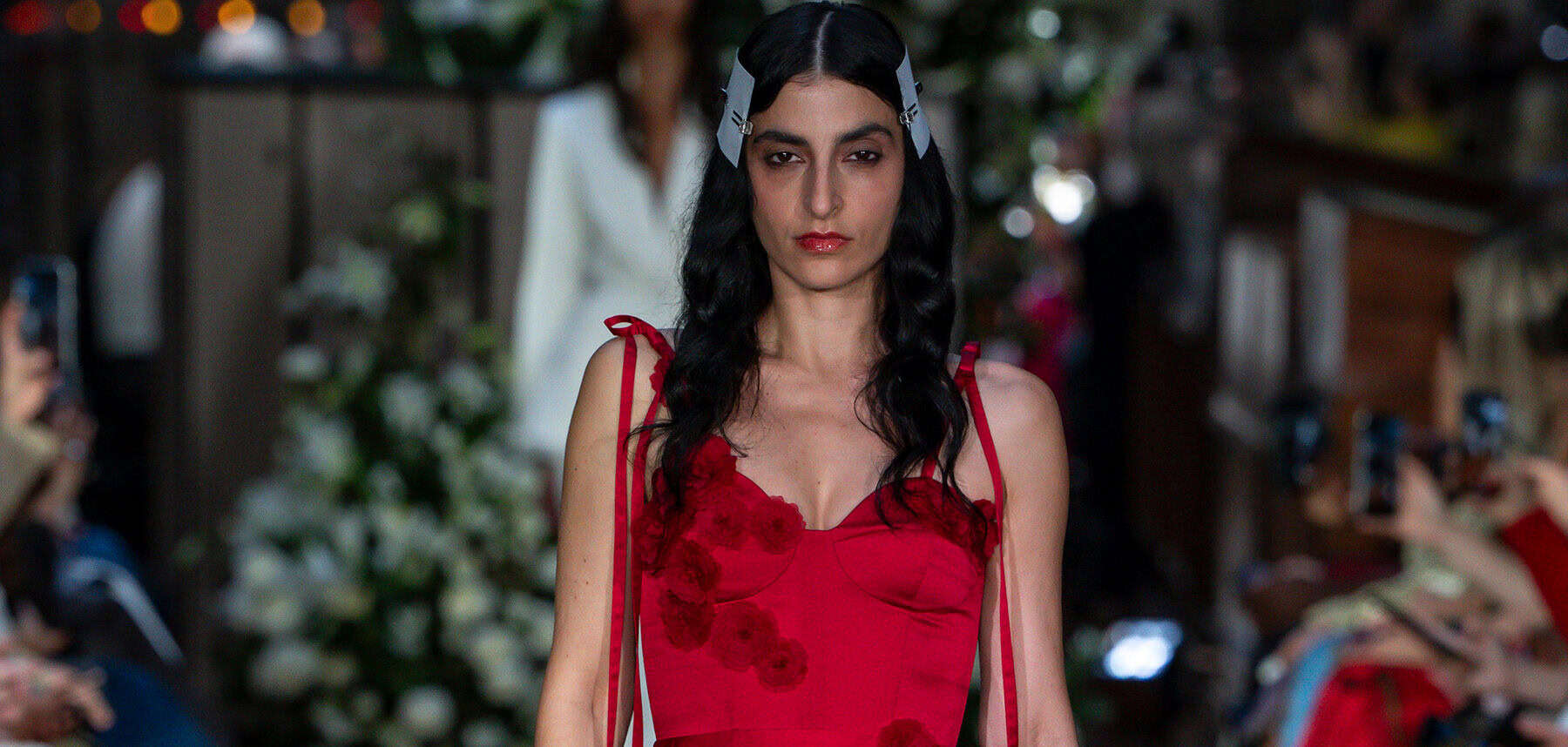 コレクションは、マクドウェルの亡くなった祖母に捧げられ、彼に裁縫を教えた人物です。『ランカシャーローズ』と題された多くのドレスは、花のモチーフで飾られており、まるで動きの中で捉えられた牧草地のスナップショットのようです。ランウェイに登場したすべてのアイテムは、Certilogoデジタルパスポートによって完全に追跡可能となります(祖母へのオマージュとして、マクドウェルは1923年の祖母のパスポートのレプリカを持ち帰るゲストに提供しました)。