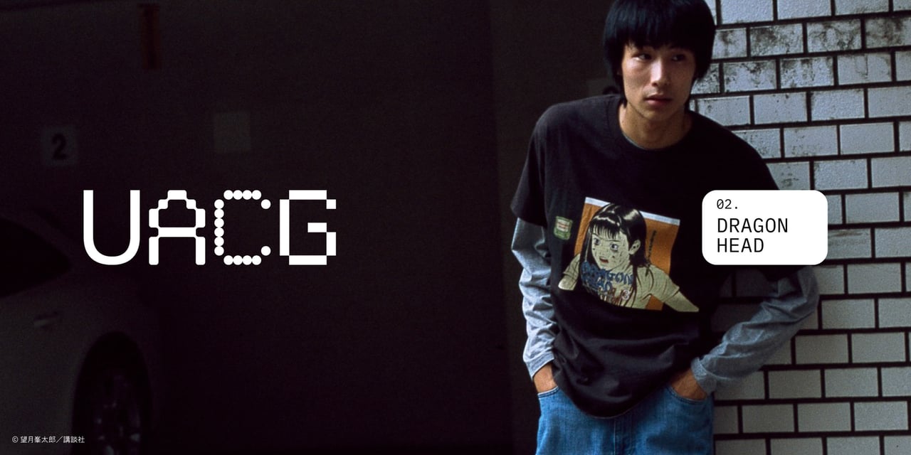 今回は、UACGのディレクターが幼少期に両親の本棚で出会った「ドラゴンヘッド」とコラボ。デザインのベースとなった全10巻のコミックのカバーヴィジュアルの原画データが現存していなかったため、作者の望月峯太郎自身がリマスターを行ったほか、Tシャツのボディにあわせてヴィンテージ風の加工を施すなど、コラボのための特別なデザインに仕上げた。表紙のデザインを忠実に再現するために、Tシャツのボディにはカバーデザインに合わせた染色を施したほか、プリントにはシルクスクリーンの多色手刷りとインクジェットを用いることで、色の奥行きとグラデーションを表現。また、全型それぞれのタグ部分には、作品の巻に合わせたドラゴンヘッドのロゴをプリントした。