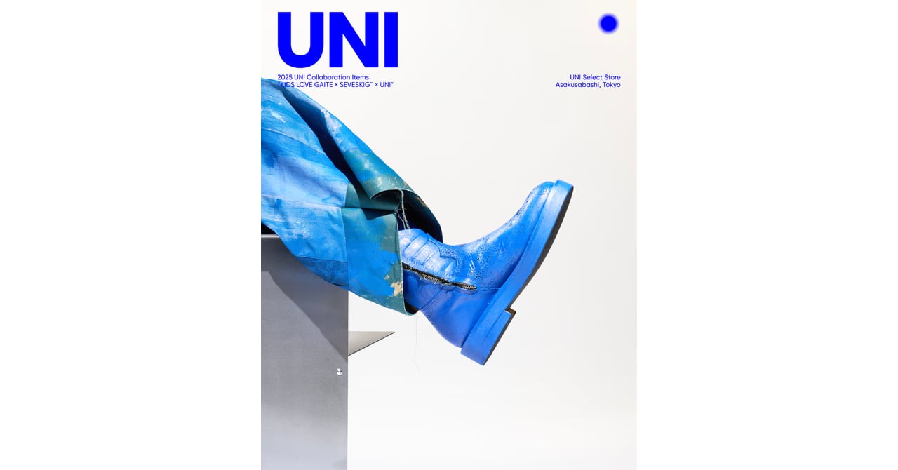 会場内部は、土のような吹付塗装の壁や青い柱などで、セヴシグの今季のテーマである「無常」や「儚さ」を表現しています。セヴシグの2025年秋冬コレクション「TO BE TWISTED」を中心に、同コレクションで注目を集める「キッズ ラブ ゲイト(KIDS LOVE GAITE)」とのコラボレーションブーツ「ラック ショートウエスタンブーツ(Luck Short Western Boots)」のUNI別注カラーを販売しています。別注ブーツは、UNIのコンセプトカラーであるブルーを配し、履き込むことで経年変化により塗膜が剥がれる仕様で、セヴシグの今季のテーマと、UNIが大切にする「経年変化の美」を体現しています。価格は19万8000円です。また、別注の販売を記念し、キッズ ラブ ゲイトのインラインコレクションも取り扱っています。