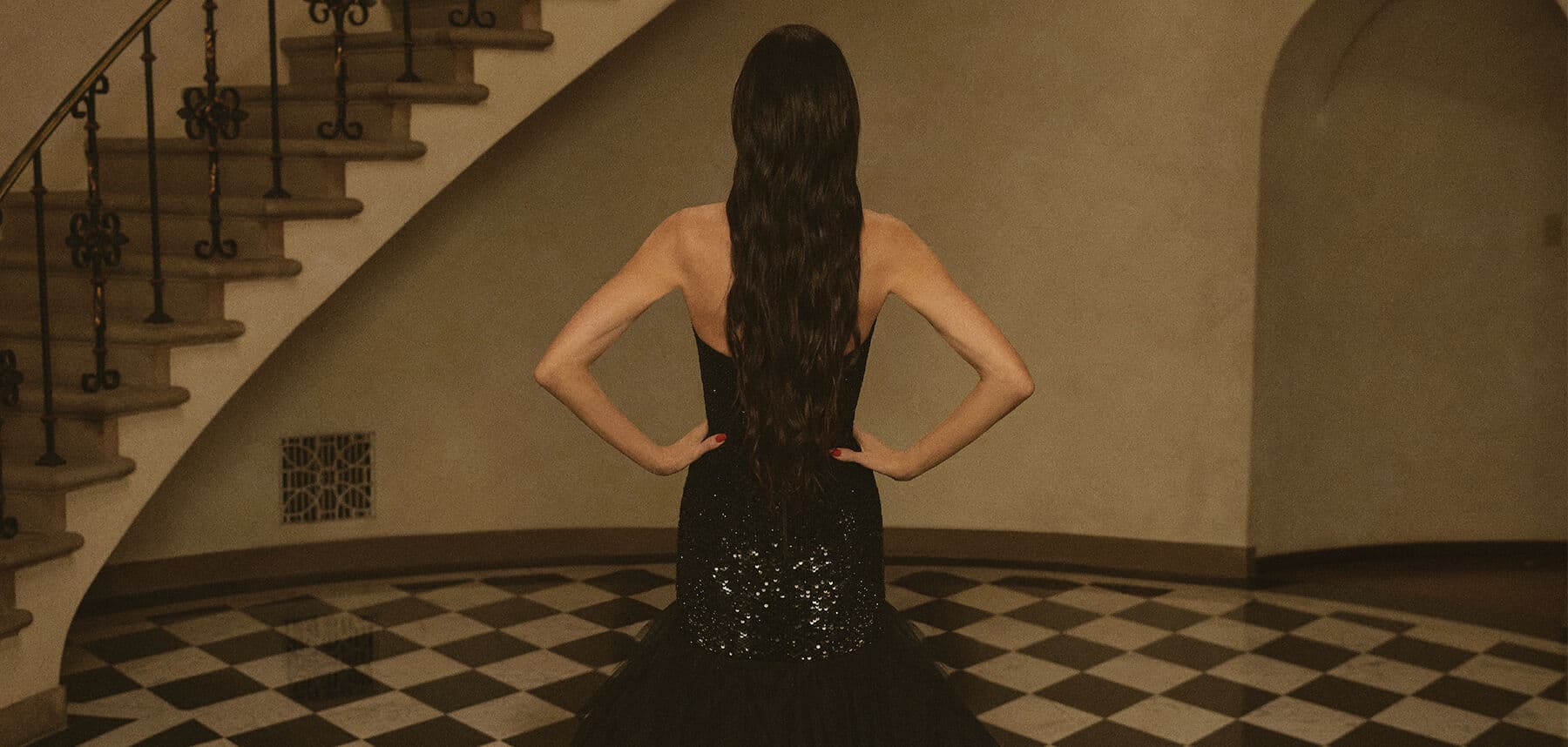 この1晩だけ、ブランドはミラノ証券取引所内に豪華なチョコレートブラウンのベルベットシアターを建設し、30分間のウィットに富んだ短編映画『The Tiger』を上映しました。それは正式な映画プレミアのように設定され、スターたちが到着する様子をパパラッチが撮影し、コレクションを身につけたルーシュなモデルが観覧席に点在していました。