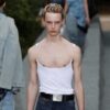 That said, Vitale didn’t base this collection – nor, it seems, his Versace as a whole – in analytical study. “Versace is almost like Coca-Cola,” he said. “I hope it doesn’t come across as offensive, but I knew it. It belongs to pop culture – I know it by heart.” So instead of a decorous redux of Versace’s greatest hits – by Gianni, or Donatella – Vitale worked off instinct, reflex. There was also a shunning of chronology, so ideas filched from Versace collections across the years – but, generally, spanning the first decade of Vitale’s own life, 1983-1993, I’d say – were combined in unexpected outfits. Casual, high-waisted striped jeans may be belted beneath a beaded, Atelier Versace-esque brassiere, a pair of nasty cone-heel satin pumps underfoot. A single floral embroidered glove might accompany hiked-up pants, a baroque-n-roll studded leather vest, and a grey marl knit. Roberts’ dress emerged chopped short in different colour ways. The menswear was pure himbo, part Versace men without ties, part the Tom, Dick and Harry that manservanted Isabella Rossellini’s Lisle Von Rhuman in Death Becomes Her. That’s a very specific reference, but those Fabio-ish beefcakes were very, very Versace.