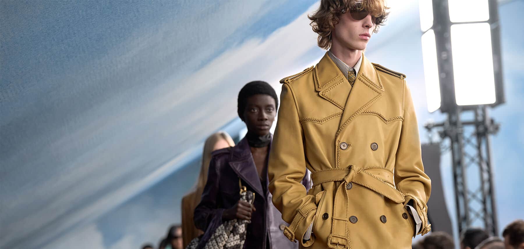 エディ・キャンベルがシャープなスーツ姿で登場し、スキニーテーラリングへのシルエットの変化を示しました。リーは、サム・メンデス監督のビートルズ映画の製作が進行中であることを見越して、スリムなテーラードルックを提案しました。これらは、バターのように柔らかい宝石色のレザーからスネークプリントや特別に開発されたワックスコーティングデニムまで、さまざまな仕上げのキレイで細い膝丈トレンチコートと共に着用されました。ベージュ?今日は違います。これは伝統的なイギリスのブランドにとってよりワイルドな一歩でした。