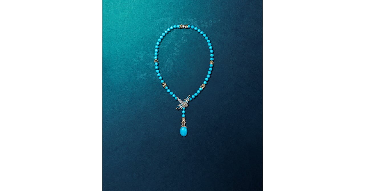 ハイジュエリーカテゴリーで際立つのが、ティファニーが1968年に発表した「レガシー ジェムストーン」であるタンザナイトを主役にしたネックレス、ブレスレット、イヤリングのシリーズと、カボション カットのターコイズにゴールドとダイヤモンドの羽根をあしらったバードモチーフのネックレスだ。後者で用いたターコイズは、ハイジュエリーにおいてダイヤモンドと組み合わせるという大胆なアプローチで当時の業界で注目を集めたシュランバージェの革新性を象徴している。