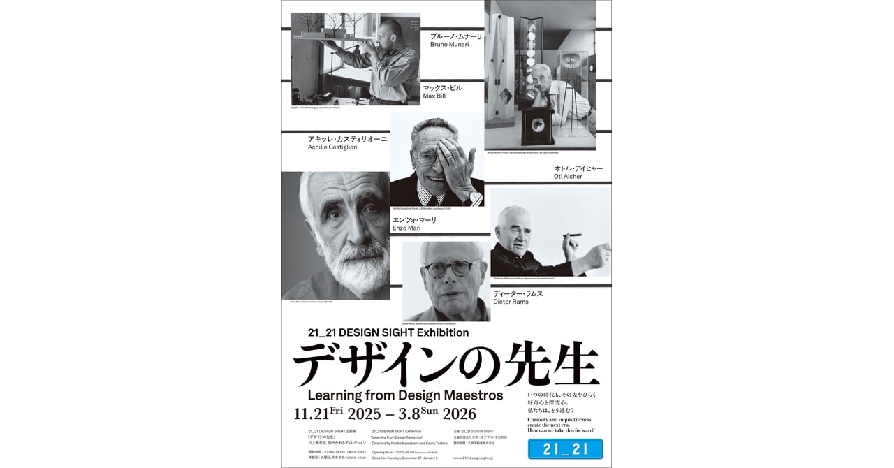 六本木のデザインの展示施設21_21 DESIGN SIGHTで、企画展「デザインの先生」が開催される。期間は11月21日から2026年3月8日まで。展覧会ディレクターは、デザインジャーナリストの川上典李子と、キュレーター・ライターの田代かおるが務める。