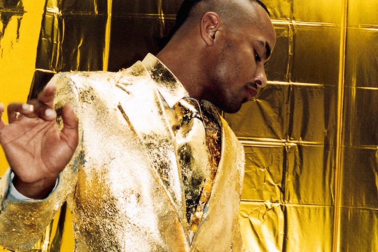 Lead ImageLie Ning is wearing a suit, shirt and tie gilded in 24-carat gold by PONTEPhotography by Larissa Hofmann, Styling by Rebecca Perlmutar
