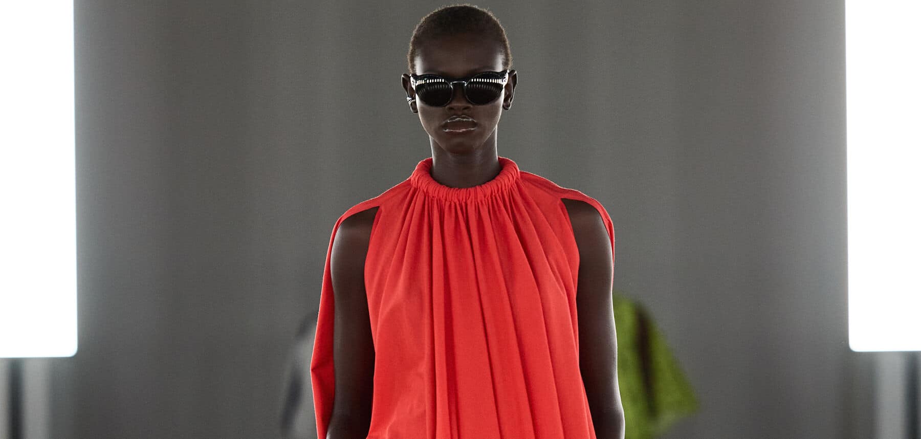 アノク・ヤイがショーをオープンし、日本風の衿が特徴の黒いプレイスーツを着用し、細いレザーベルトでウエストを引き締めました。他のスリークなアイテム – ボンバージャケット、プリーツブルマ、スポーティなボディコンドレス、そして解剖学と動きから着想を得たC+アクティブウェアとタイツは、キノコ革を使用したものも含まれています。