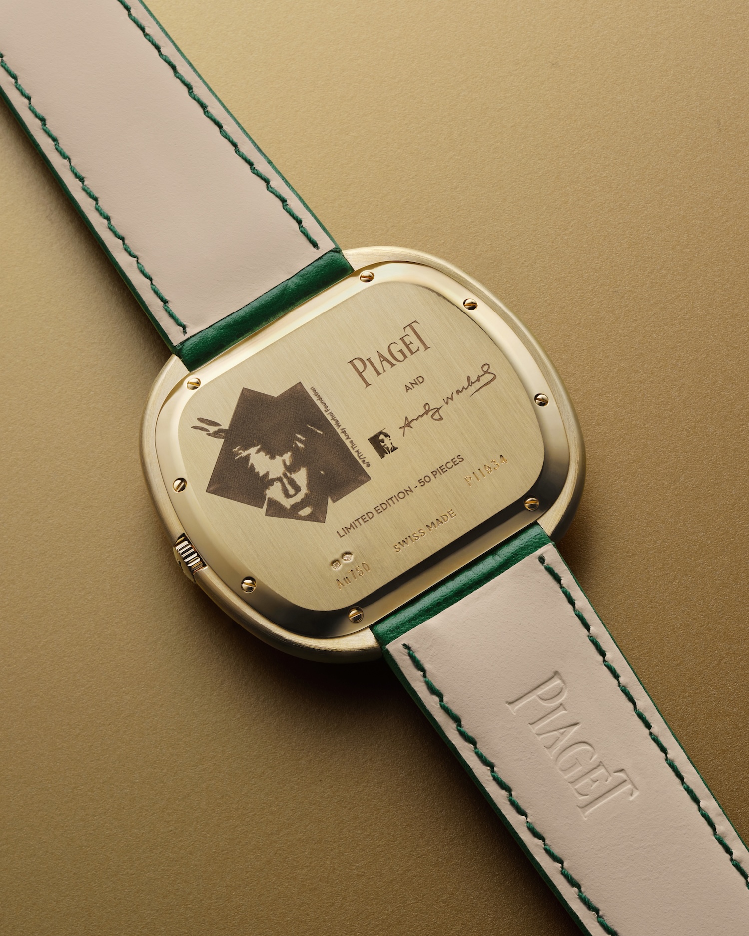 This artistic homage is powered by precision mechanics. Inside the case, Piaget has installed its in-house 501P1 self-winding mechanical calibre, a slimline power unit with a 40-hour power reserve. While the movement is hidden, the solid 18-carat yellow gold caseback is a collectible piece of art in its own right: it features a vertical satin finish overlaid with an engraved rendition of the very self-portrait that inspired the dial, complete with Piaget’s logo and Warhol’s signature. The watch is finished on a green leather strap, a rich, mature colour chosen specifically to add to the palette without distracting from the dial.