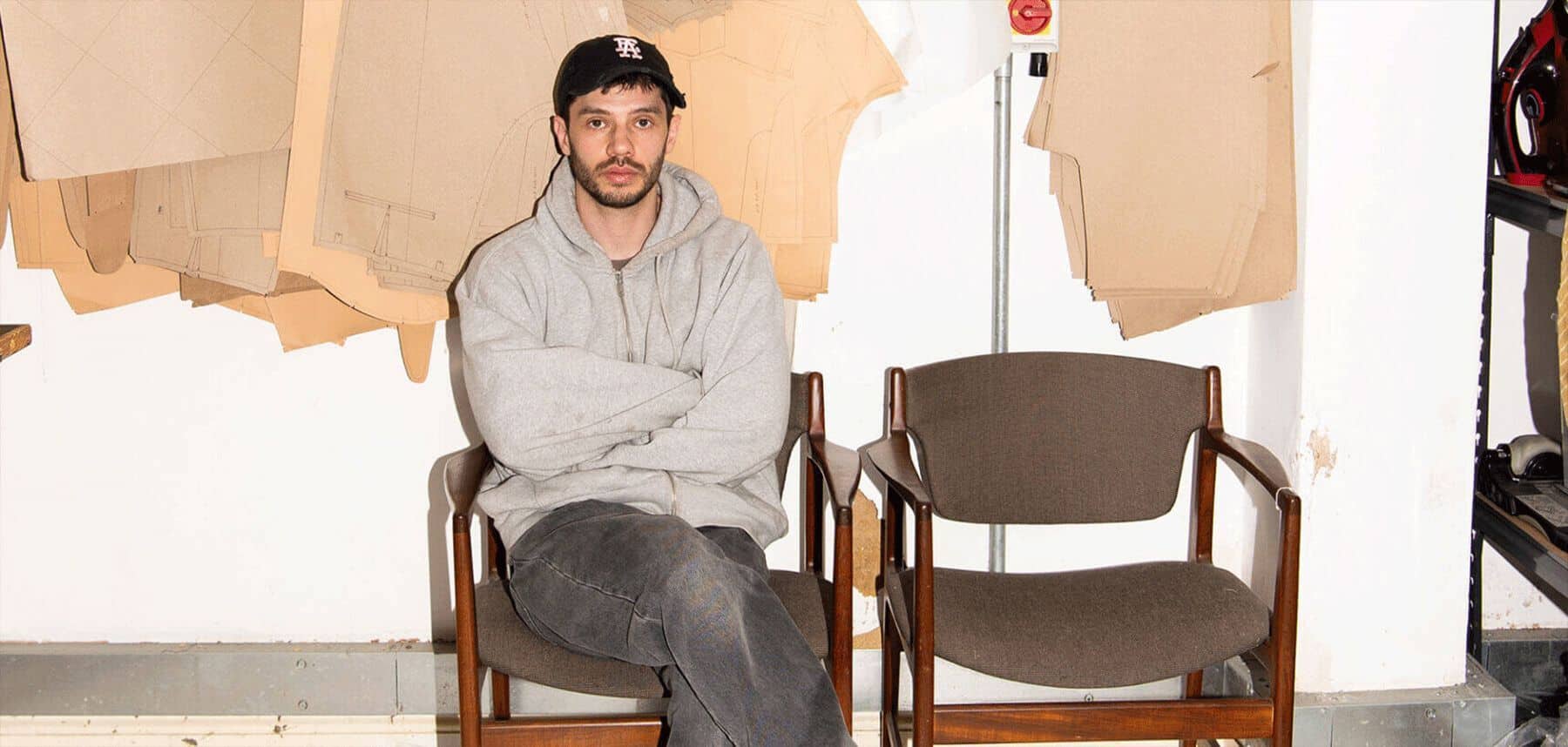 グレーのディストレストキャップに身を包み、ニューヨークのブランドTelfarのUggブーツとフーディを着用して、アーロン・エッシュは、イズリントンのエセックス・ロード近くのクリーニング店のシャッターの下から現れます。スタブル顔で、魅力的な笑顔と優しい態度を持つ姿は、彼の叔母が所有する場所であり、学生時代からスタジオとして使わせてくれていることを説明します。