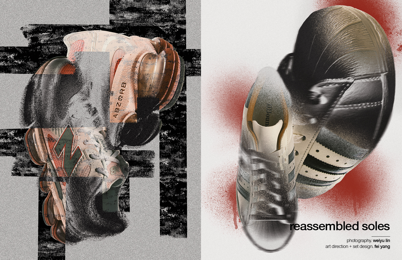 新しい物語が隠された断片。このショーン!49エディトリアルでは、それぞれの靴が機能的な目的を超越し、断片化と衝突の層を通して再解釈されます。切り取り、重ね合わせ、再構築を通じて、これらのコラージュはアイデンティティと動きの新しい物語を構築します。馴染み深いものが乱され、変容します—それぞれの靴底は歴史の印だけでなく、継続的な再発明の可能性を持っています。写真はWeiyu Linによるもので、アートディレクションとセットデザインはFei Yangが手がけています。
