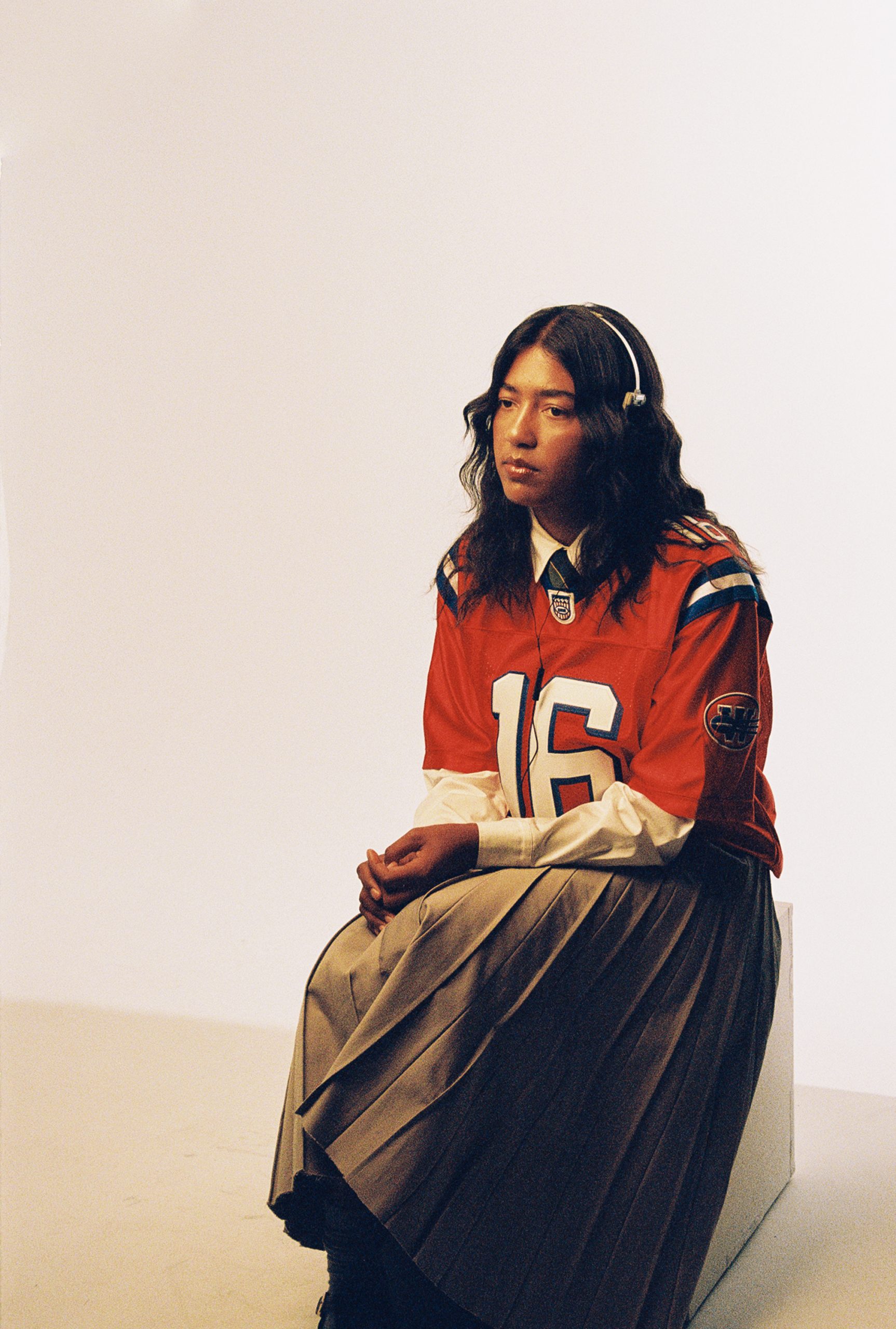 レザージャケット、タンクトップ、スカート、ブーツを着用