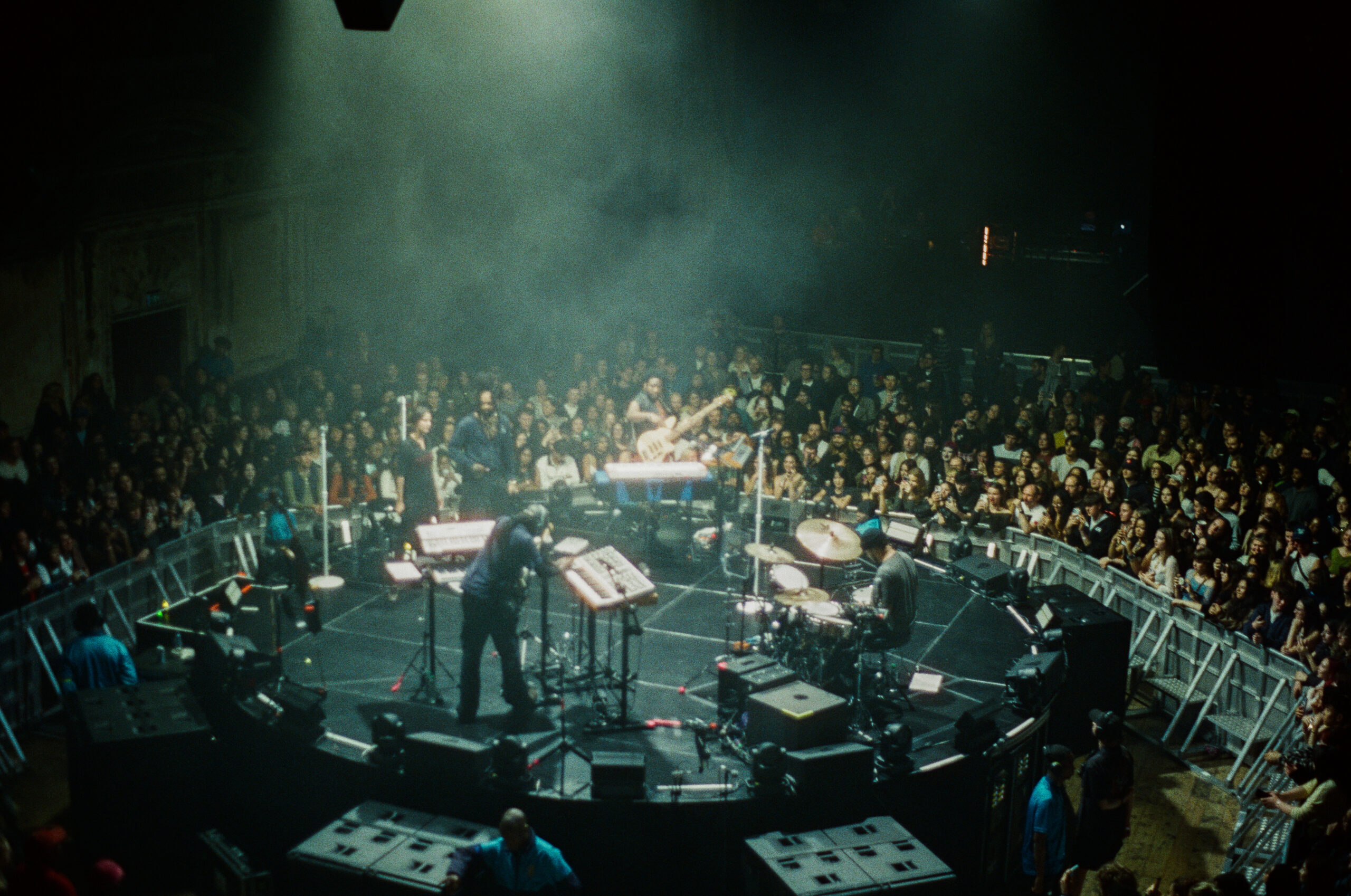これらすべてを考慮に入れながら、アリー・パリへの登頂と劇場への入場は、それ自体が帰郷のようなものでした。周囲をざっと見渡すと、ブラッドオレンジのファンはスペクトル全体から集まっており、クールなオールドヘッドがコーナーでメールをスクロールしている一方、ティーンエージャーの仲間がエセックス・ハニーのグッズを手に入れようと列を作っています。中には、ASICSのトレーナーやTurnstileのTシャツを着た若者たちがビールを飲みながら、午後のグラミー賞のノミネートについて話しているのも見られました(彼らはPinkPantheressの大ファンでした)。私は最前列から数列離れた場所にすっかり落ち着いた後、ハインズと彼のバンドが舞台に向かう様子を目にしました。部屋の中央に配置されたステージへの短いがしっかりした拍手が起こり、突然観客が耳を傾け、熱心に聞き入っていました。