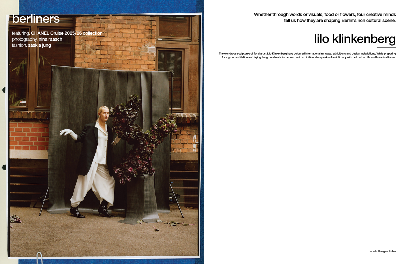 言葉、ビジュアル、食べ物、花を通じて、4人のクリエイティブマインドがベルリンの文化的な鼓動をどのように形作るかを明らかにします。その中で、花のアーティスト、リロ・クリンケンベルクは、儚いものを非凡なものへと変えます。国際的なランウェイから没入型の展示まで、クリンケンベルクの彫刻作品は都市と植物の間をつなぎます。彼女は「ファッションも花も、身体、空間、素材の間を行き来する何かを創造することに関わります」と述べており、シャネルを身に着けながら、彼女の作品とスタジオリロの創造についてSchön!に開陳します。
