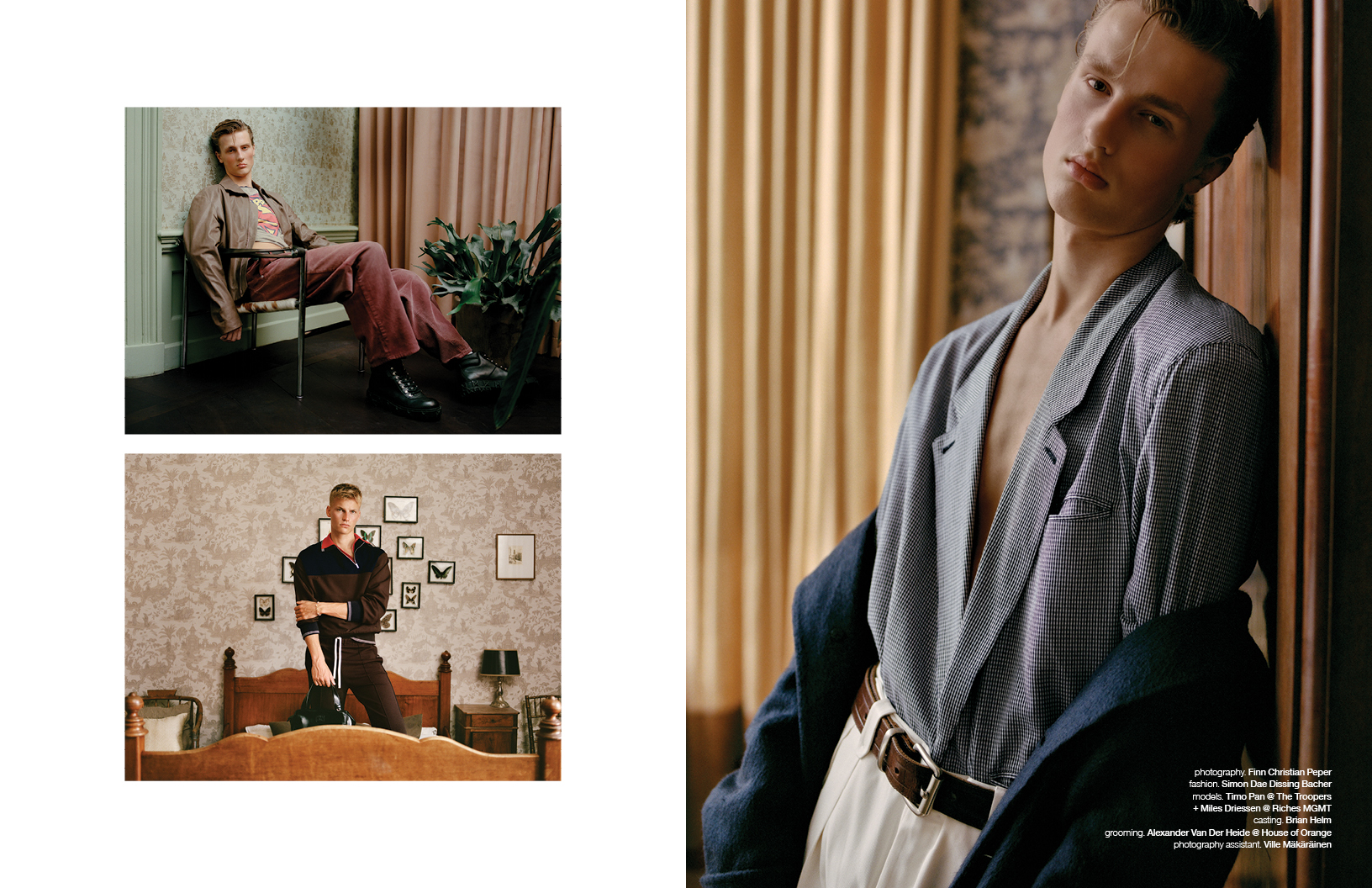 閉ざされた扉の向こう側で、再発明は静かな形を取ります。家は孤独の場所であり、私たちが誰であり、誰になろうとしているかを考え、反省する場所です。この Schön! 49 エディトリアルでは、Timo Pan と Miles Driessen が自分たちの私的な部屋の一端を共有しています。Dsquared2、Valentino、LOEWEなどのルックスを身に着け、Finn Christian Peper によって撮影されたPanとDriessenは、ドレッシングの親密さをたどるストーリーでスタイリスト Simon Dae Dissing Bacher によってスタイリングされています。