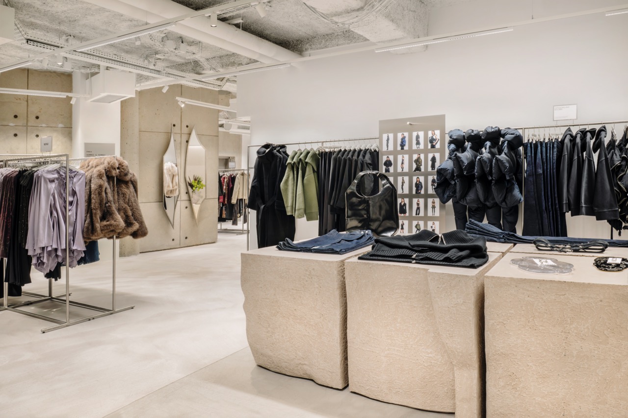 スペース内部では、コンクリートの壁と柱がブラッシュドスチールとガラスブリックと相まって、現代的なブルータリストの雰囲気を醸し出しています。デザインは厳しいテクスチャと洗練と遊び心のバランスを取り、まさにウィークデイのアイデンティティを完璧に反映しています。訪問者がスペースを移動すると、各レベルで新たな発見が待っています。コンクリートの階段は顧客をデニム、ニットウェア、アクセサリーを収めた石のテーブルに導き、抽象的な鏡、移り変わるライトインスタレーション、緻密なディテールが探索を促しています。
