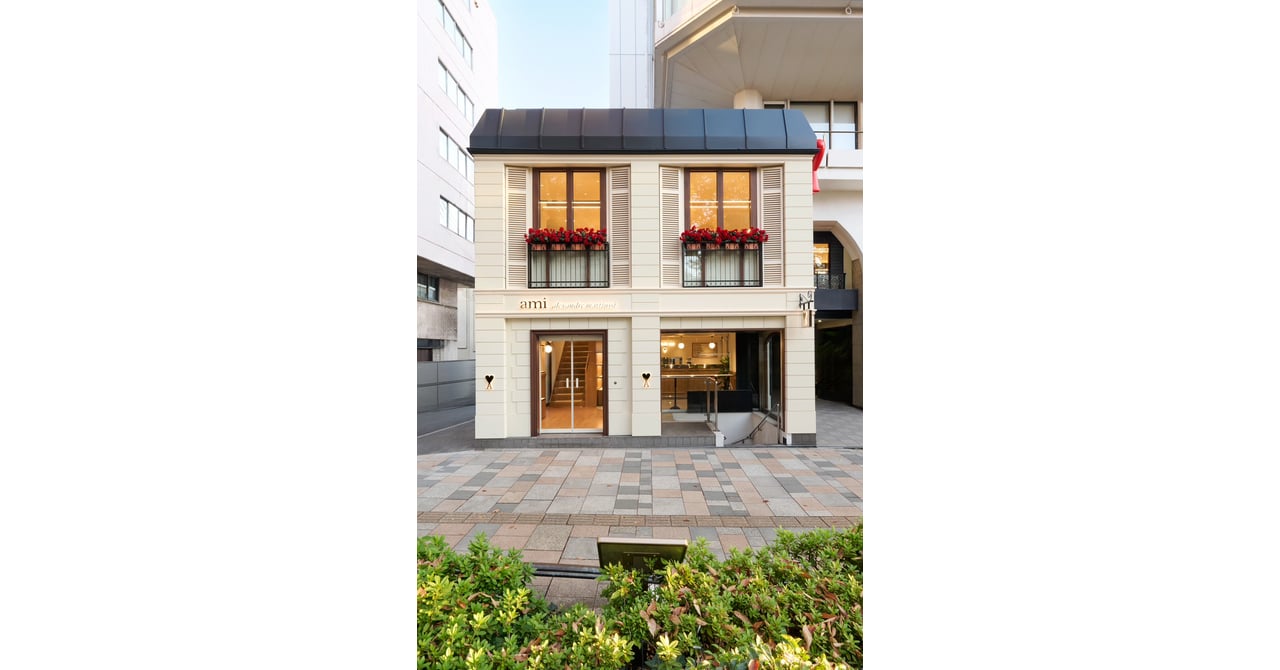 ポップアップは、明治神宮前駅からほど近いローソンの隣のビルにオープンしました。1階と2階の2フロア構成で、売り場面積は約136平方メートルです。店内は、「第二のパリジャンホーム」をテーマにデザインされており、ベージュのライムペイントやライトオークの木材、パーケットフローリングなど、アミ パリスのブティックを象徴する素材が使用されています。さらに、シーズンごとに変化を加え、「進化型」の空間として展開されています。