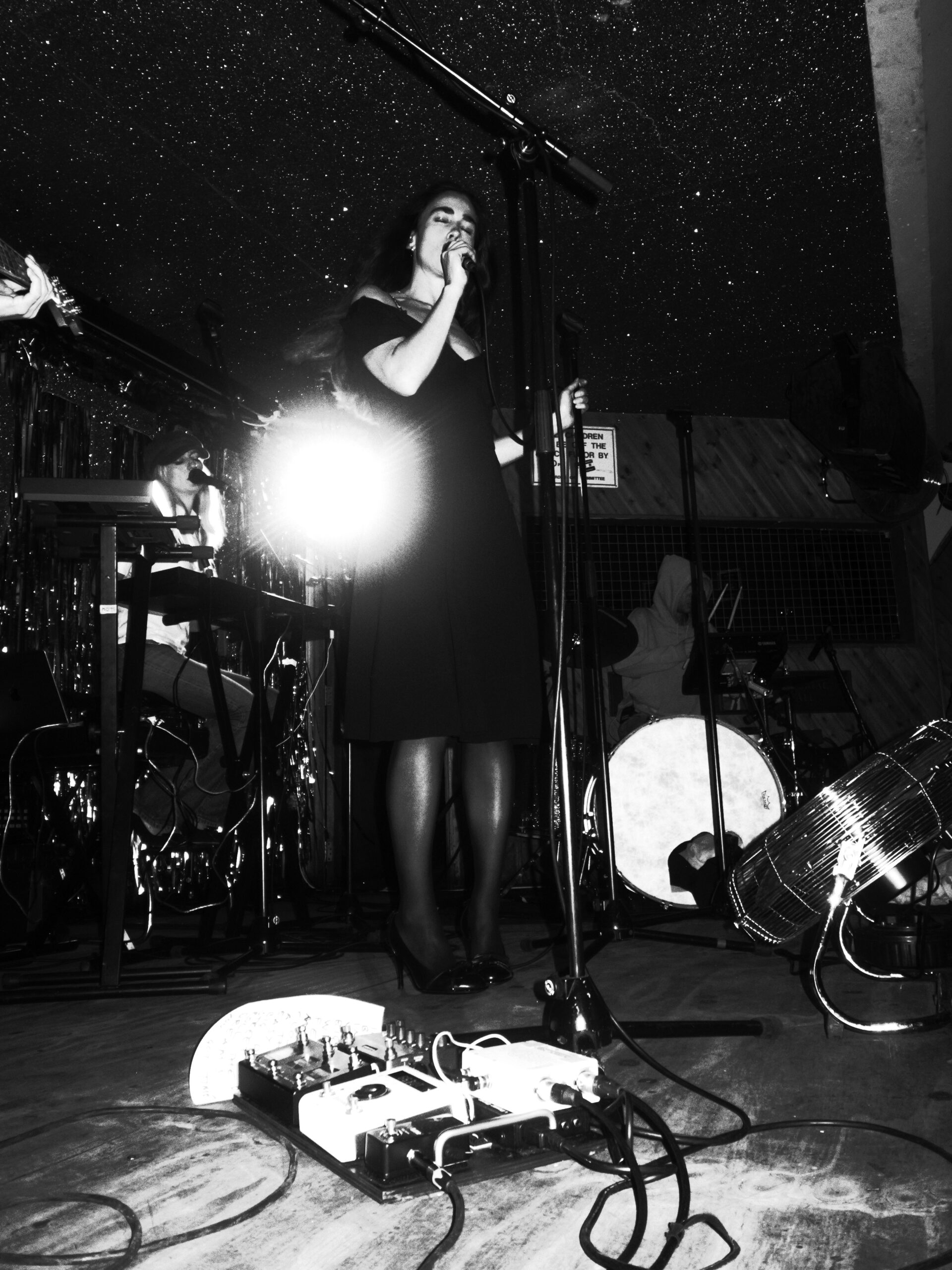 マイクの両側に2つのファンが吹いています。空気の波がステージを飾る金のティンセルのカーテンを揺らします。Catharinaは背を向けており、Henrietteがキーボードを弾き始めます。 “街を歩いていると…” 2人が微笑み合う。Catharinaは足音の音を真似してマイクをタップし、観客を楽しませます。