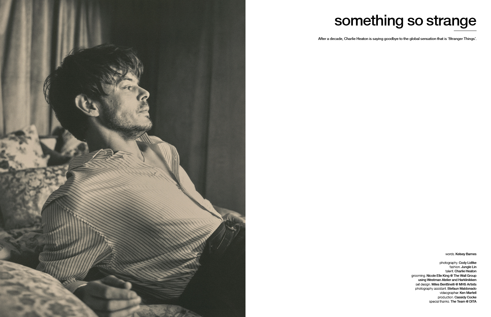 最終シーズンの撮影は数か月前に終了しましたが、ヒートンはまだ『Stranger Things』の世界に少し頭があります。昨年のほとんどはこの番組の撮影に費やされ、10年間の仕事を締めくくりました。「人々が尋ねてくれたのを覚えています。『これを懐かしいと思う?』と。」ヒートンは回想します。「人々がいることを懐かしく思うでしょう。それらのセットにいることを懐かしく思うでしょう。その1年、共演者とセットで働くたびに、本当にその瞬間を感じました。撮影プロセスが終わり、それを締めくくる方法がどのように完璧に行われたか、それ以上に良いことはありませんでした」と彼は微笑みます。「後悔することは何もありませんし、変えたいこともありません。それはまるで卒業して本当に良い気分になるようなものです。」