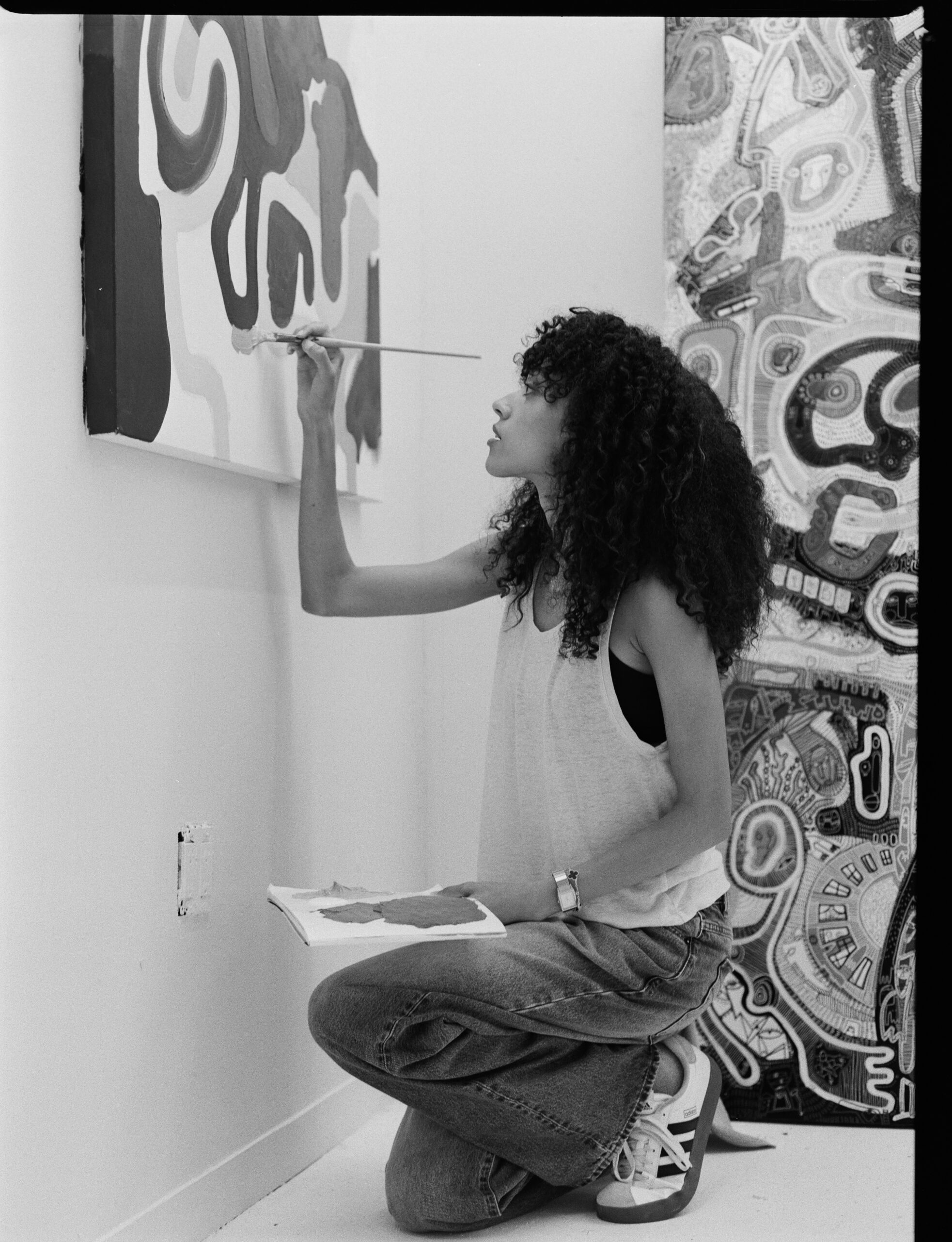 彼女が絵を描き続けるにつれて—色を重ねたり、形をスケッチしたり、心を形に変えたりするにつれて—私はしばしばそれを受け入れるために後退しました。時には沈黙の中で、時にはフィルムを変える間に、しかし常に、深い存在感を持って彼女の作業を見ていました。そんなにチューニングされた人を目撃するのは珍しいことです。