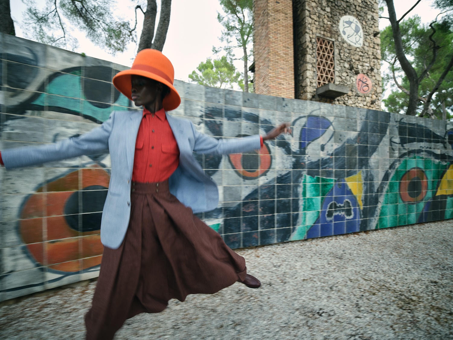 服は村のリズムに溶け込みます。軽やかなジャケットは地中海の風をキャッチし、流れるようなズボンはミローの迷路の鋭い幾何学的な線を反映しています。明るいオレンジ色の大ぶりのフェルトハットとエクストラソフティバッグは途中に現れ、後者は腕に低く持たれたり、カジュアルに横に挟まれたりします。コレクションはその環境に対する配置が楽しいものです。暖かい天候に適したテーラリングは日光に浴びた石と調和し、柔らかい色は風化した壁や密集した緑に合わせます。何も過剰にドレスアップされたり、中立的になめらかにされたりしません。