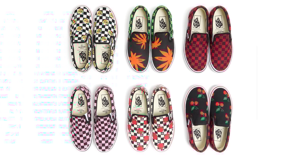 アイテムは、ブラック/レッド、ブラック /ピンク、ブラック/ホワイトのチェッカーボードをベースに、Vロゴや赤のドットをあしらった柄、トロピカルリーフ、ブランドオリジナルの猫のモチーフ「ル シャ デ ラ メゾン」、新たに加わったチェリー柄の全6種をラインナップしています。また、いずれも両ブランドのロゴを組み合わせたインソールを使用しています。価格は各7万2600円です。