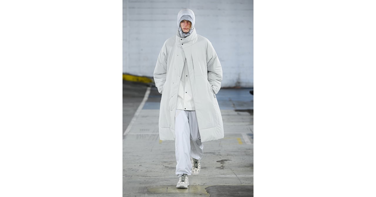 計算されたオーバーサイズのレイヤードスタイルは、日常の動作を妨げないよう緻密に設計。プリントや柄を排除して無地で統一し、素材そのものが持つ質感やボリューム感を鮮明に映したアウトドアウェアを提案した。