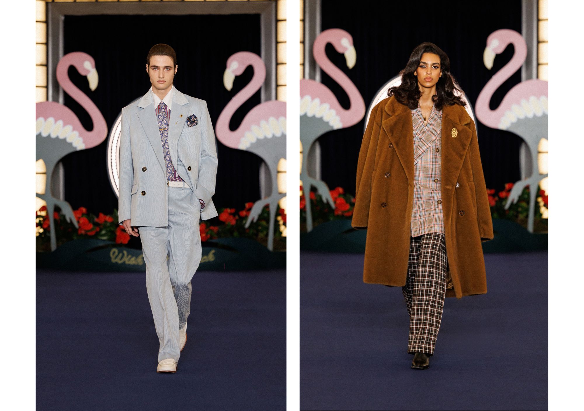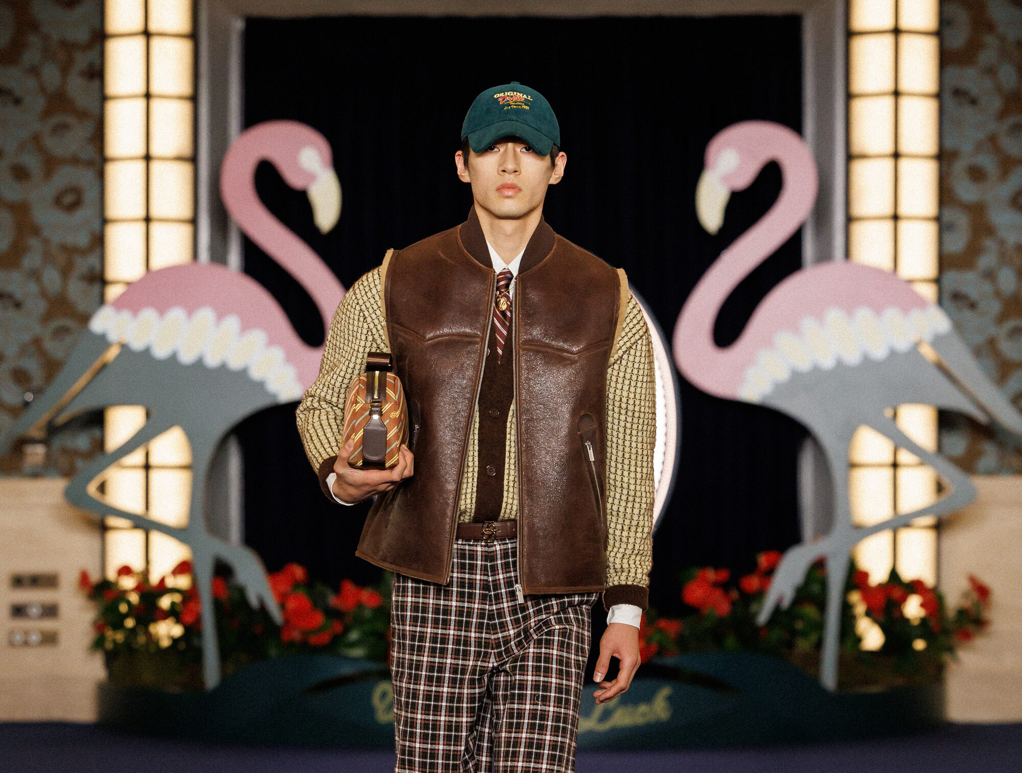 ショーノートでは、1946年にラスベガスストリップにあるカジノホテルのフラミンゴが開業したこと、そして「街が豪華で魅力的で力強い独特の劇的な世界を形作り、映画とその象徴的なハイソサエティの人物たちによって不滅のものになった」と述べています。この考えは、ランウェイの背景に並ぶ2つの巨大なフラミンゴだけでなく、ヴィンテージ風のプリント(プレイド柄、ストライプ柄、花柄、木をイメージした模様)、過剰なレイヤリング、金のジュエリーにも現れています。静かなだけでなく、混沌とも言えない。焦げたオレンジ、明るい赤、コニャック、深い青、そして鮮やかな緑が互いをバランス良く保っています。