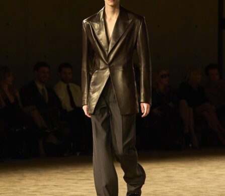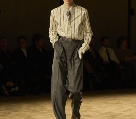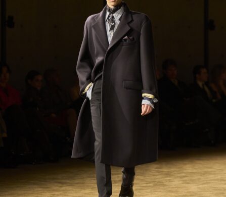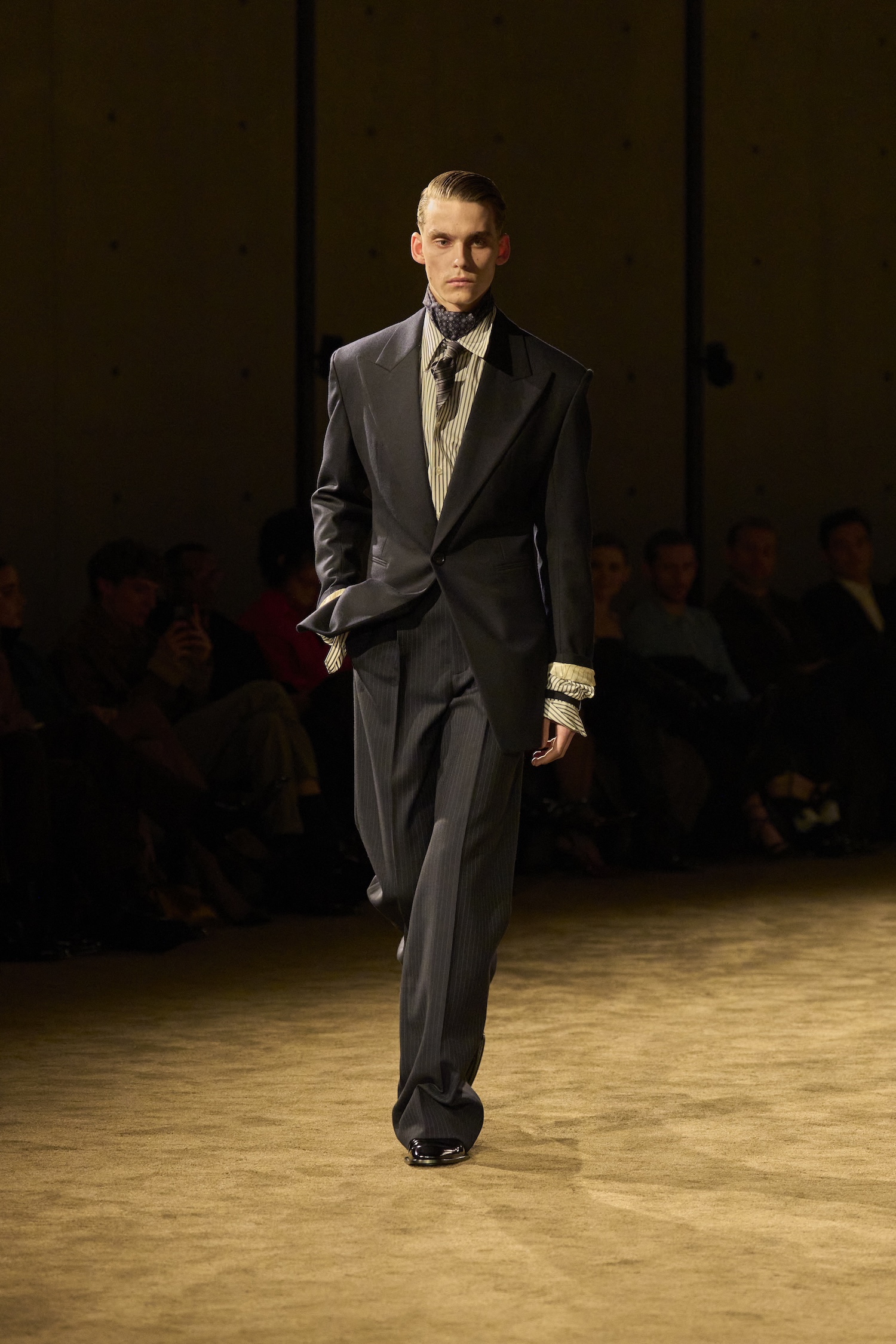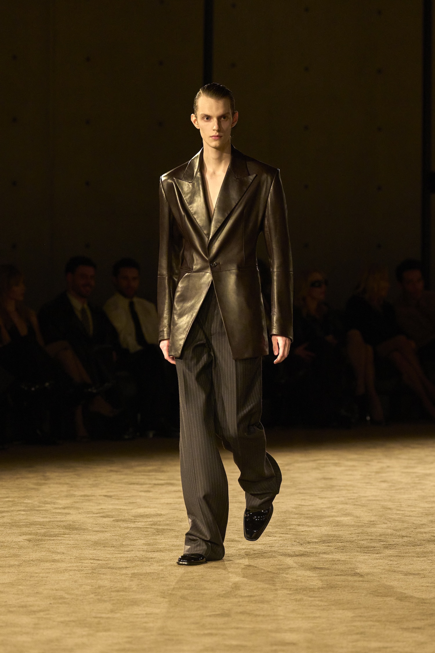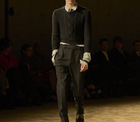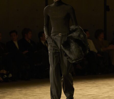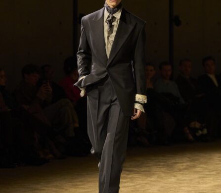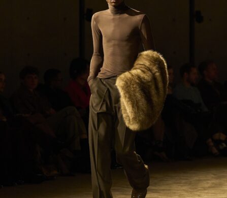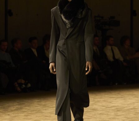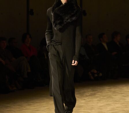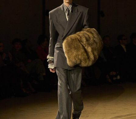 Low-neckline jumpers peeked beneath tailored jackets, introducing a hint of softness against what might otherwise have felt like rigid structure. There were pinstripe patterns tucked into ensembles, appearing on shirts, suits and layered looks that felt both classic and modern at once. Furs appeared as considered accents, adorning collars trimmed with soft pelts or jackets backed with subtle hair.