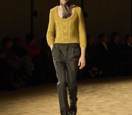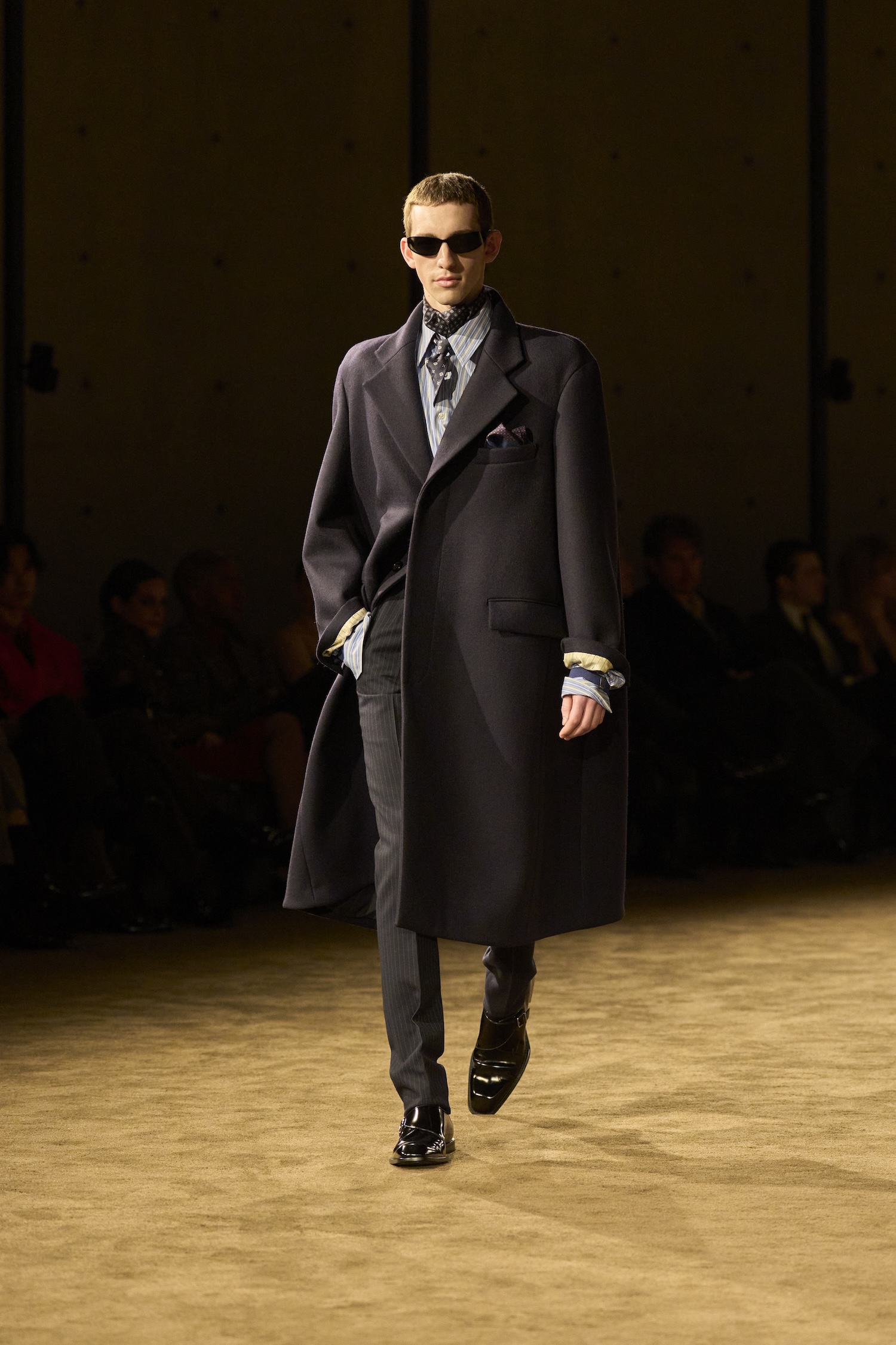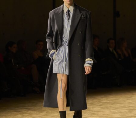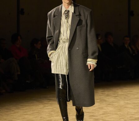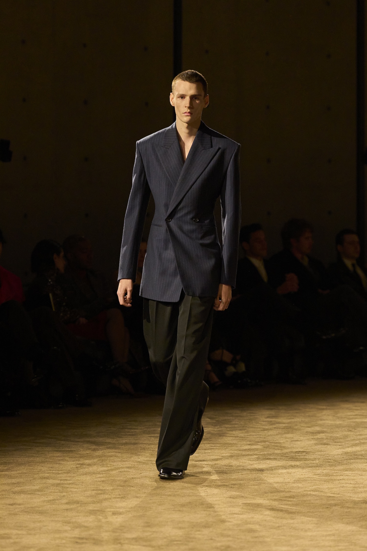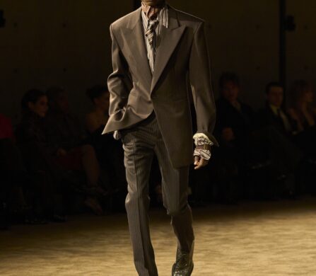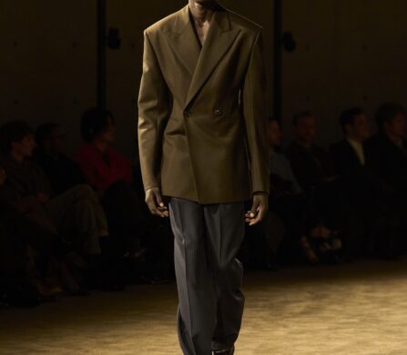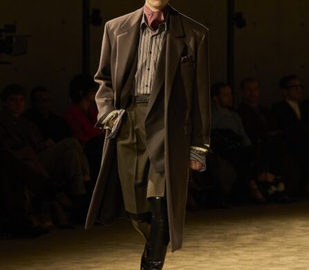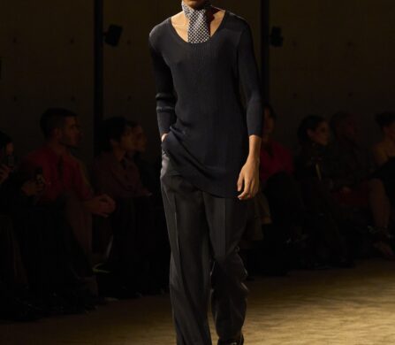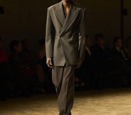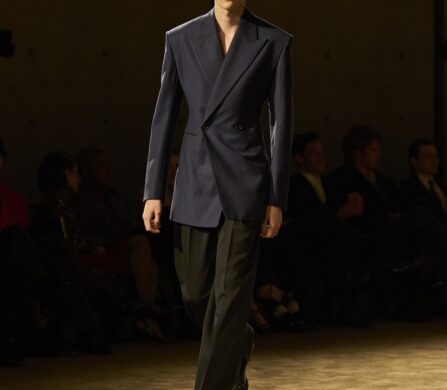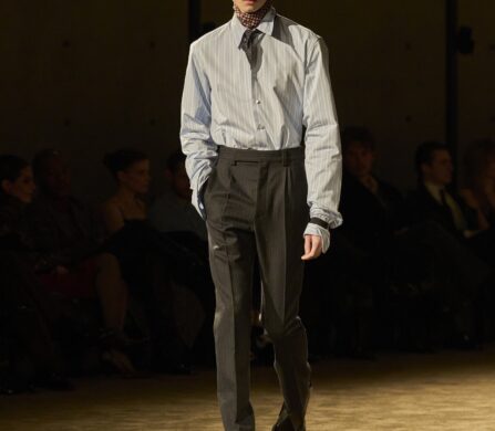 Low-neckline jumpers peeked beneath tailored jackets, introducing a hint of softness against what might otherwise have felt like rigid structure. There were pinstripe patterns tucked into ensembles, appearing on shirts, suits and layered looks that felt both classic and modern at once. Furs appeared as considered accents, adorning collars trimmed with soft pelts or jackets backed with subtle hair.
