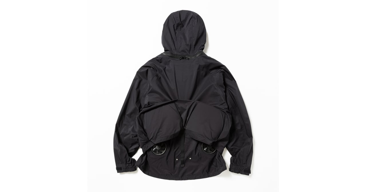 「Air Circulation System Rain Jacket / Light」は、2020年に発表されたファーストモデル「Air Circulation System Rain Jacket」をベースに、表地に薄くて軽量な20dナイロンを採⽤することで着用感を向上。ファンを取り外して通常のジャケットとしても着用できるほか、フードや袖も取り外し可能で3パターンのスタイリングを楽しめる。