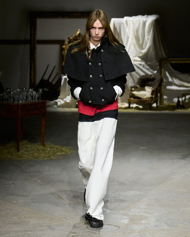 Oscar Ouyang brought playful, maybe even anarchic energy to his second runway show. He imagined a rowdy soirée unfolding in lavish country estates, with models wearing masquerade masks, surrounded by empty glasses and hay bales. Outfits felt like a wardrobe heist: military jackets, capes, and heritage tweeds borrowed from parents’ closets layered over shredded jeans, oversized trapper hats, and relaxed wool trousers. Ouyang’s strenght lies on the knitwear, with Fair Isle sweaters and turtlenecks incorporating epaulette-like shoulders and distressed details, while tailoring combined Virgin wool with LVMH-sourced llama. The cast looked effortlessly youthful, rebellious, and impeccably styled.