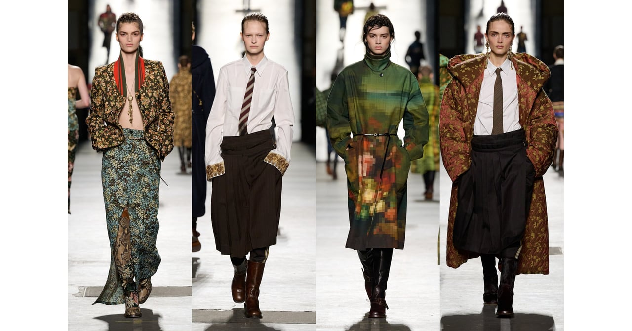 ランウェイでは、学生時代の服を思わせるクラシックなアイテムが登場しました。ダッフルコートやシャツ、ネクタイ、プレッピーなブレザーなどが端正で落ち着いたスタイルを演出しています。しかし、刺繍やジャカード、異素材のレイヤリングなどが加わり、スタイルは徐々に自由な方向へと展開しています。