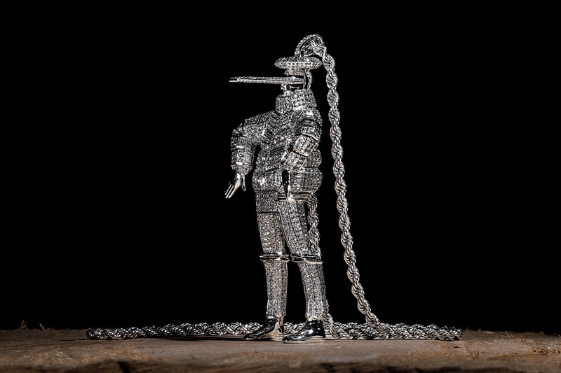 本作は、小畑の代表作である高さ190cm超の木彫作品「B-BOY Down jacket NANAME 2016」を約1/20スケールへと縮小し、ネックレスとして再構築したもの。素材には、朽ちていく木とは対照的な10Kホワイトゴールドとダイヤモンドを採用し、彫刻表現を新たな領域へと拡張している。