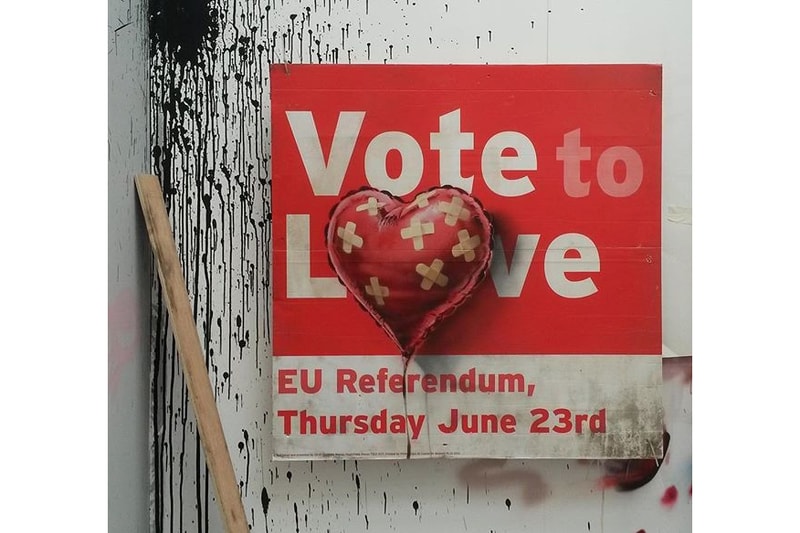 今回のアートワークは2016年頃に世界を騒がせたイギリスのEU離脱、通称ブレグジット(Brexit)をテーマにしたもの。その作品は絆創膏で補修された薄汚れたハート型の風船と“Vote to Love(愛に投票を)”の文字が描かれ、その下には“EU Referendum(欧州連合人民投票)”の文字、更に実際にイギリス国内において欧州連合離脱是非を問う国民投票が行われた2018年6月23日を指す“Thursday June 23rd”の文字が配されたポスター調のデザインに。ちなみにこの作品は現在、イギリス・ロンドン中心部にある国立美術学校/美術館の『Royal Academy of Arts(ロイヤル・アカデミー・オブ・アーツ)』にて8月半ばまで開催中の展覧会“250th Summer Exhibition”にて展示中となっている。