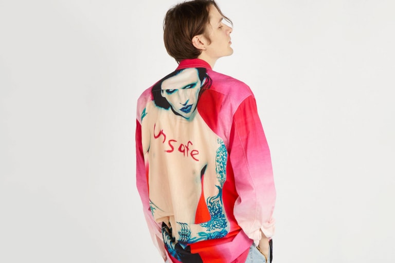 Demna Gvasalia(デムナ・ヴァザリア)の真骨頂であるヴィンテージ古着とミリタリーの融合を全面に打ち出した〈Vetements(ヴェトモン)〉2018年秋冬コレクションが遂に立ち上がりを迎える。そのなかでも一際異彩を放ち、来期の#Streetsnaps常連アイテムとなるであろうド派手シャツが大手オンラインブティック『Matchesfashion.com』に登場した。ピンクカラーのグラデシャツに“悪魔の使者”ことゴスロック界の重鎮アーティスト、Marilyn Manson(マリリン・マンソン)の写真を大胆にプリントした本作は、現在917ドル(約103,557円)で予約受付中なので、少しでも気になった方は購入を検討してみてはいかがだろうか。