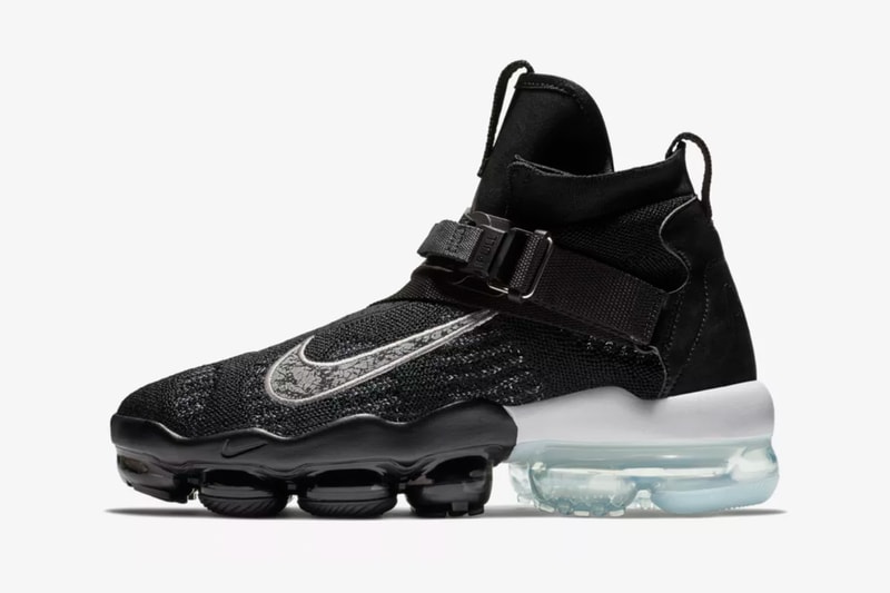 その新作モデルはVaporMax Premier Flyknit(ヴェイパーマックス プレミア フライニット)と名付けられ、アウトソールには前後でクリア/ブラックとカラー切替デザインが落とし込まれたVaporMaxユニットを搭載。アッパーにはソックスのように足を包み込むFlyknit素材を採用し、履き口には長めにシュータン&ハイトップでミリタリーブーツのようなテイストを演出。シューレースシステムではなく十字に交差するレザーストラップとマグネット式留め具が足をしっかりと固定し、驚くほど快適な履き心地を実現しているとのこと。