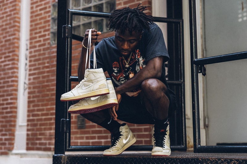 今モデルは、Nigel自身の履き古されたスニーカーがモチーフになっていることもあり、シューズ全体に及ぶダメージ加工が最大の特徴。加工は手作業で行われているため、全てのスニーカーが少しずつ異なる風合いとなり、ひとつとして完全に同じものは存在しないようだ。さらにNigelのライディング時の態勢にあわせ、左右で汚れが度合いが異なるという点や都会のコンクリート上での擦れを表現したアウトソールの白い汚れ、夜間時の安全性を確保したリフレクティブ素材など細部に渡るこだわりを説明。また上のフォトギャラリーでは、今シューズの実際のモデルとなったNigelの私物AJ1を並べて撮影しており、擦り切れたウィングロゴなど数々の傷あとが確認できる。音声は英語のみとなるが、インタビューの模様は下のプレイヤーより閲覧可能なので、シューズのビジュアルと共に是非チェックして頂きたい。