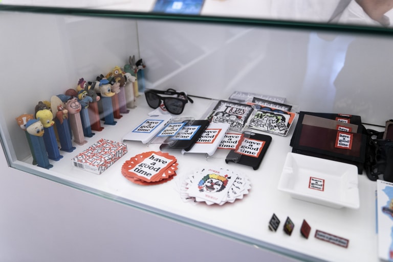 スケートやサブカルチャーなどを背景に持ち、中目黒の裏路地の小さな店から独自のスタイルを提案する〈have a good time(ハブ ア グッド タイム)〉が、ニューヨークのダウンタウンに進出した。日本のリアルなストリートカルチャーを発信する同ブランドがアメリカ初出店の場として選んだのは、混沌とした街並みで地元民にも愛されるロウアー・イースト・サイドのチャイナタウン。お世辞にも広々とは言えないながらも、そんなところにさえ〈have a good time〉らしさを感じる店内には、Tシャツ、パーカ、帽子、バッグ、アクセサリーなど、誰もが一度は見たことあるであろうお馴染みのボックスロゴグッズを配したアイテムが所狭しに並べられている。また、ユニークでコアなアイテム群が棚や壁を覆い、ストア一面からブランドのマインドとして深く根付く“楽しさ”が漂っている。