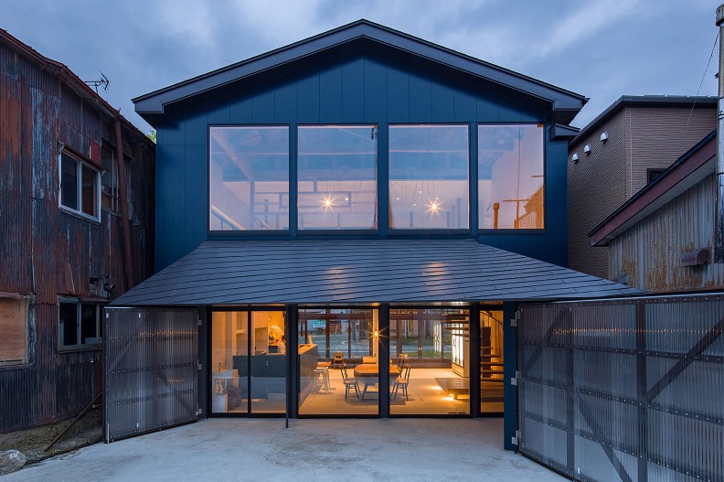 複数回の増築で複雑化した既存建物を減築し、三角庇と開閉するビックドアによるマイクロスケールの増築を行うことで機能性と耐震性を確保した2階建ての建築物は、極寒期に風除室として機能するこの半屋外空間によって、表通り・裏庭・酒蔵・朝市通りをつなぎ合わせる歩行ネットワーク賑わいを創造することに成功。また、室内の設計面では、既存の木下地や欄間、使いこまれた建具や家具などと、新設される部材や素材を一体的に扱うことで、時間の中で成熟された価値とこれから積み重ねられる価値が同居するデザインを実現している。一階はショッピング&エキシビションスペースに加えて、利き酒などを楽しむことのできるコミュニティーバーを用意。また、螺旋状の階段を登ると、用途に応じて表情を変える柔軟性に富んだイベントスペースが広がっている。