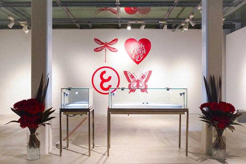 『HYPEBEAST』は一足先に、ポップアップ会場となった『Gallery COMMON』に潜入し、店内を撮影する貴重な機会を得た。〈Girls Don’t Cry〉の世界観を落とし込んだピアスは、実物をその目で見ると先日公開したビジュアル以上に繊細で、〈CAREERING〉のものづくりへ対するこだわりを感じることだろう。また、ピアスのみならず、Tシャツやスウェットといったアパレルも販売されることが判明。Tシャツは2種類展開となり、1つは〈Girls Don’t Cry〉のロゴの右上を切り落としたかのような初見のグラフィックが背中を大胆に飾り、フロント胸元にはVERDYお馴染みのフォントで〈CAREERING〉のブランドネームをプリント。一方、ブラックボディのものはグラフィックにリフレクト素材を採用しており、バックには店内中央にある4つのグラフィックがプリントされた特別仕様となっている。