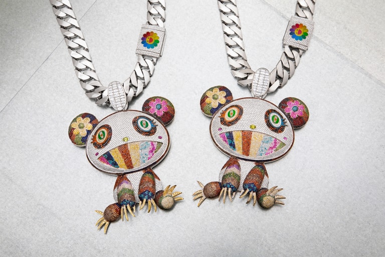 今アイテムは、村上隆のアイコニックな“パンダ”を象った18金ホワイトゴールドのボディーに、ダイヤモンドをはじめとする5000個以上の宝石をあしらった合計約42カラットの豪華絢爛な仕上がりに。さらに、チェーンの留め金には、ホワイトダイヤモンドがギッシリと詰め込まれ、その上にお馴染みの“お花”のモチーフがあしらわれている。